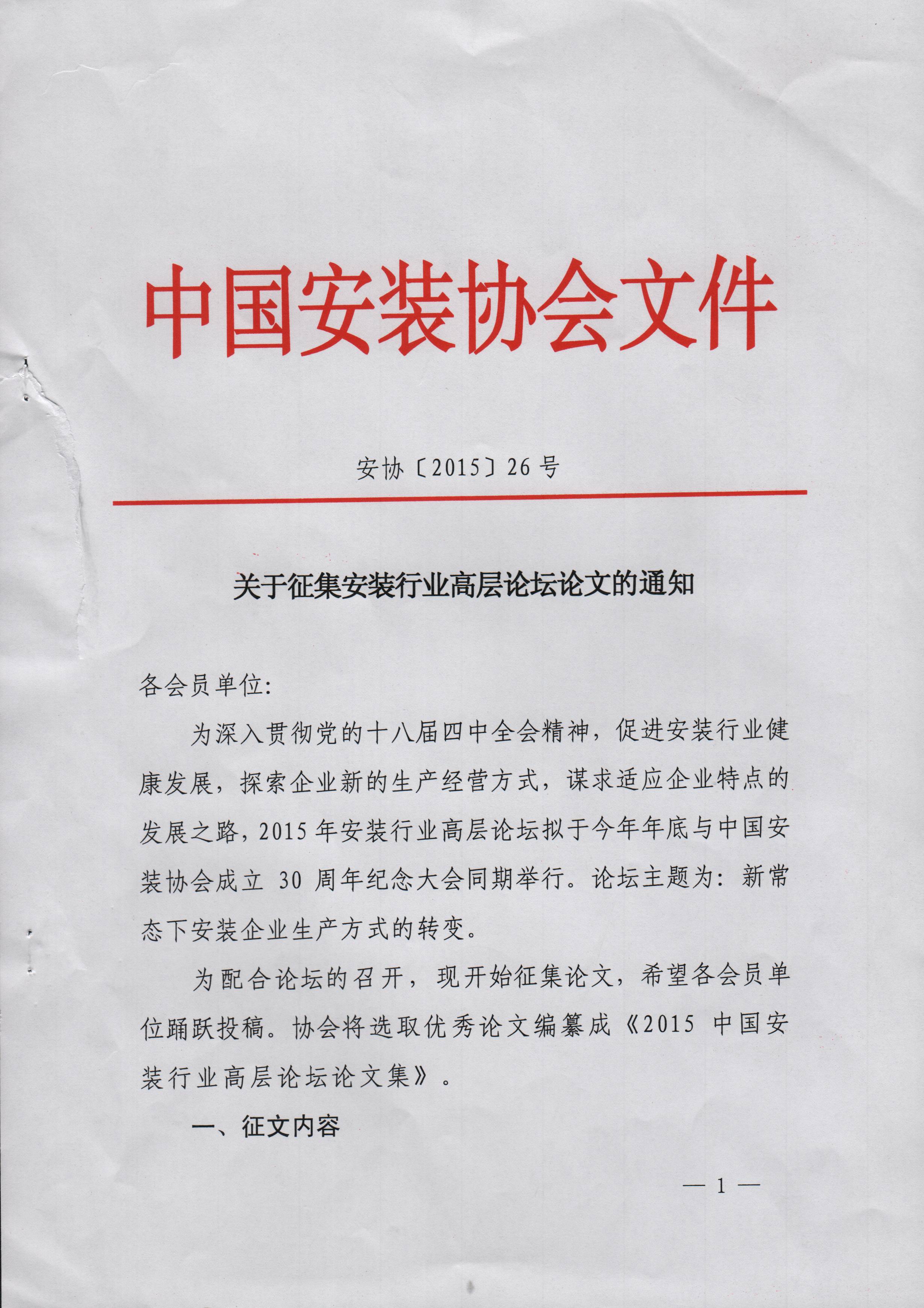 關(guān)于征集安裝行業(yè)高層論壇論文的通知
