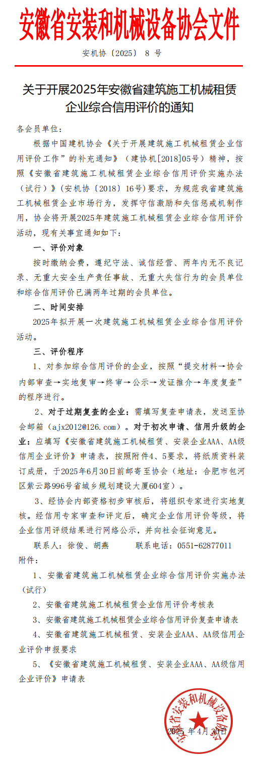 關(guān)于開展2025年安徽省建筑施工機(jī)械租賃企業(yè)綜合信用評價(jià)的通知