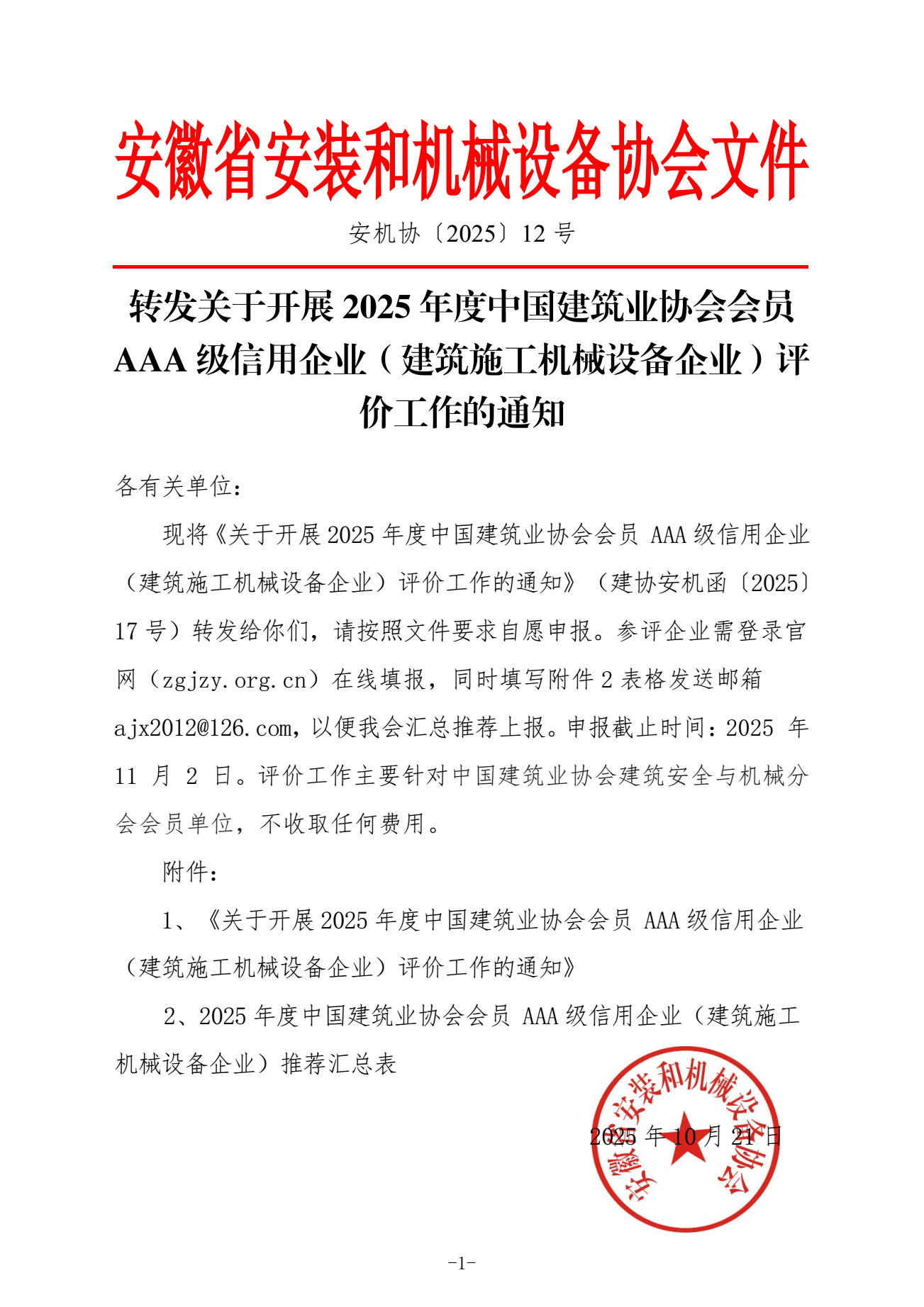 轉(zhuǎn)發(fā)關(guān)于開展2025年度中國建筑業(yè)協(xié)會(huì)會(huì)員 AAA級(jí)信用企業(yè)(建筑施工機(jī)械設(shè)備企業(yè))評(píng)價(jià)工作的通知