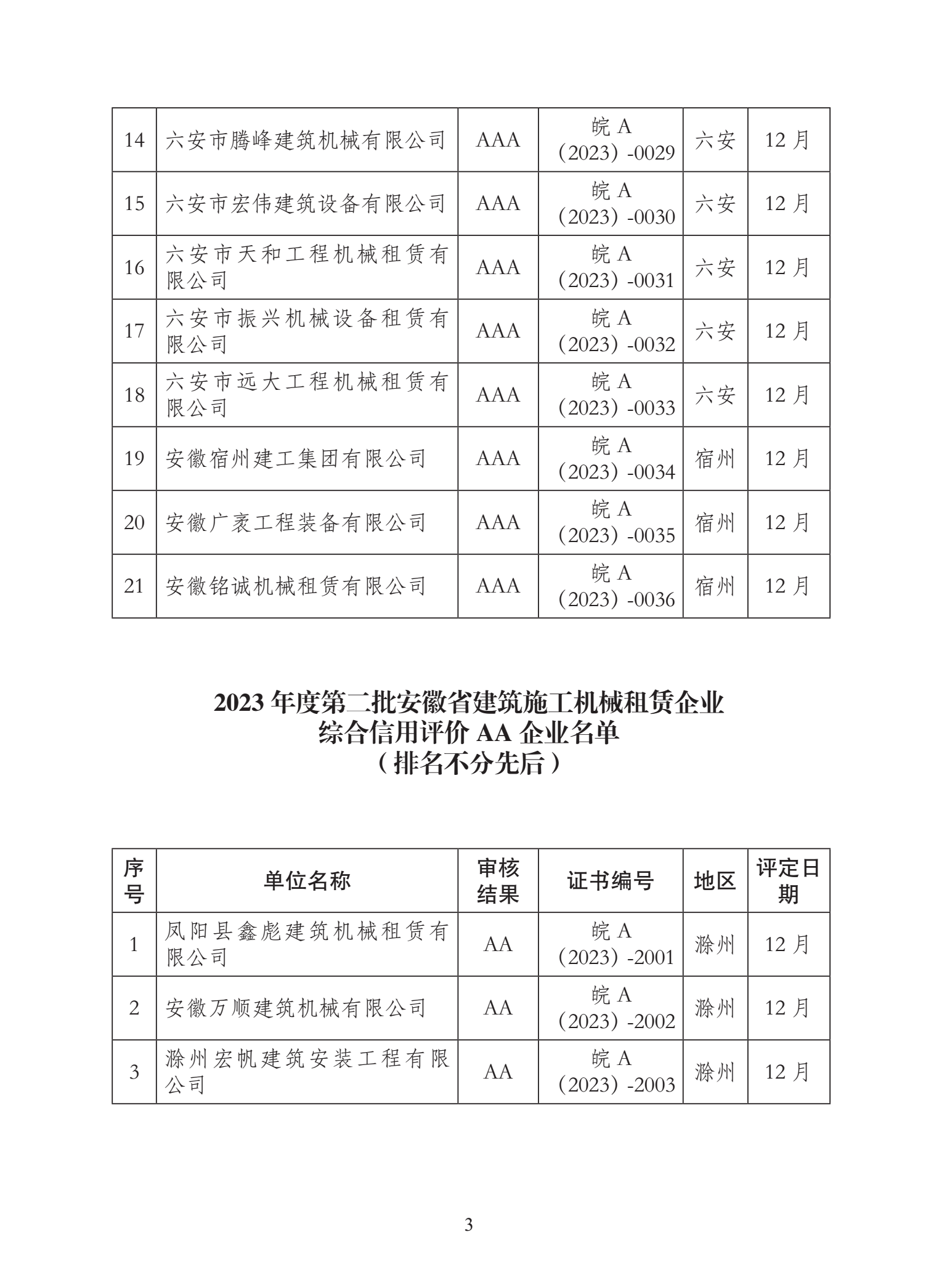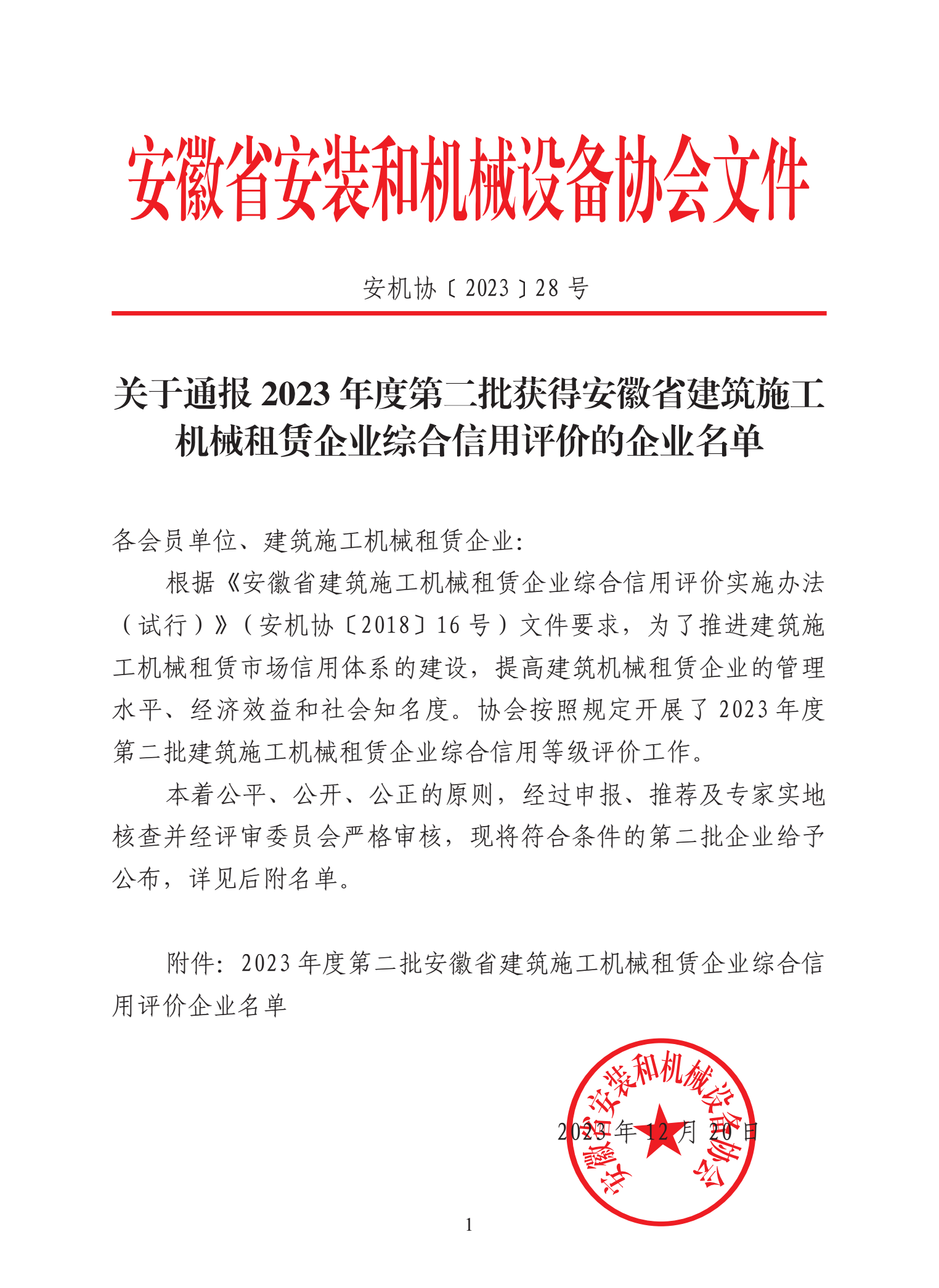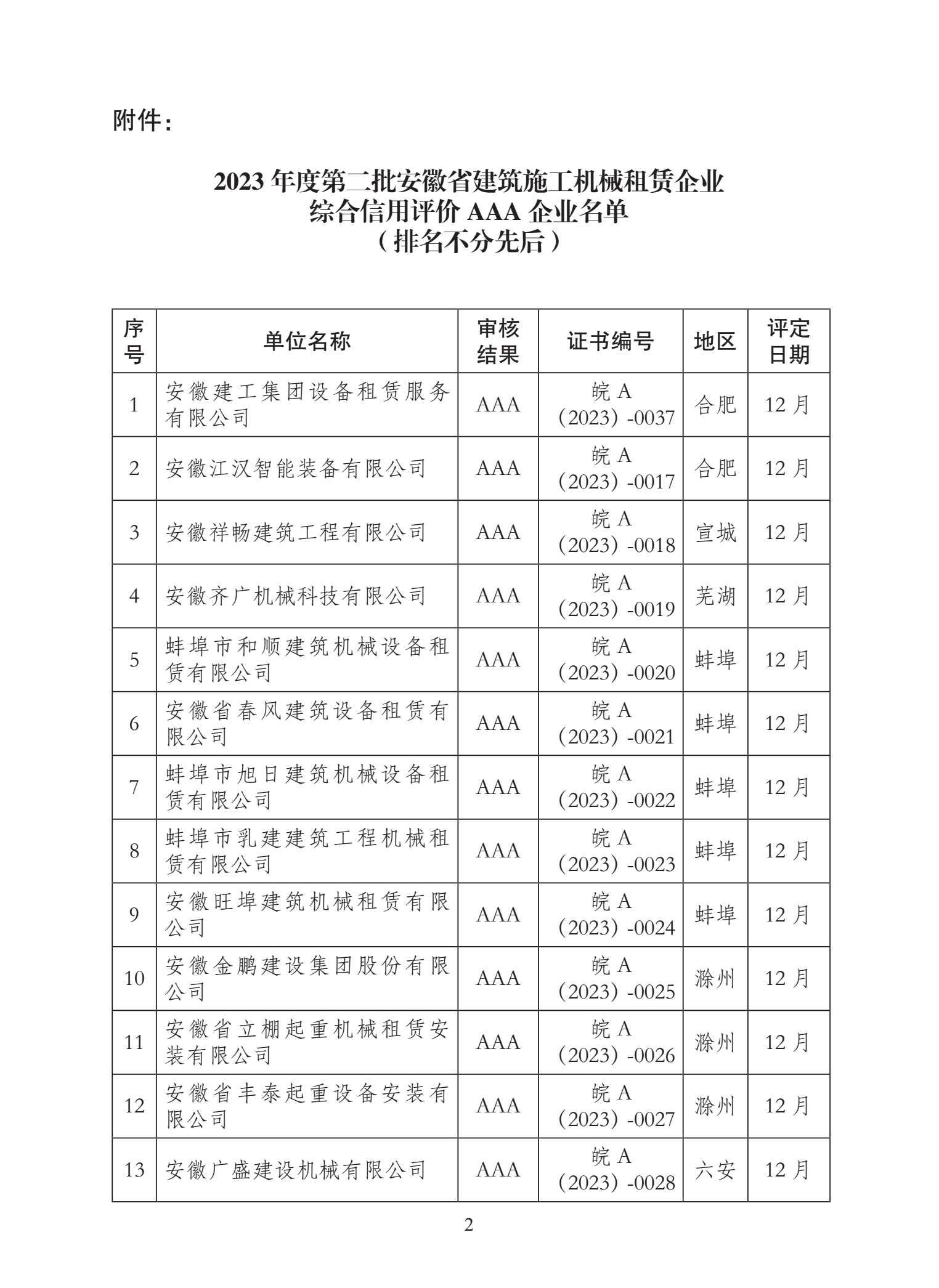 關于通報2023年度第二批獲得安徽省建筑施工機械租賃企業(yè)綜合信用評價的 企業(yè)名單